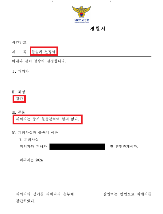 수사기관은 이러한 사정과 자료를 종합적으로 검토한 끝에, 고소인의 진술만으로 강간 혐의를 인정하기 어렵다고 판단했습니다.