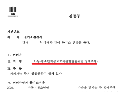 경찰이 의뢰인을 송치하였지만, 검찰에서는 다행히 의뢰인에게 미성년자 인식에 관한 고의가 인정되기 어렵고, 신체접촉에 강제성이 있다고 단정하기 어렵다고 판단했습니다.