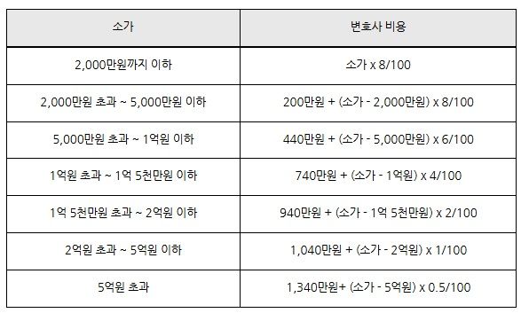 소가(訴價)를 기준으로 변호사 비용을 산정하며 구체적인 산정방법은 아래 표와 같습니다.