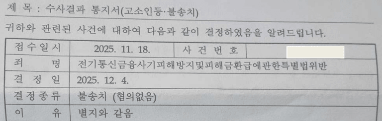 그 결과, 경찰은 의뢰인에게 보이스피싱 범행에 가담하려는 고의가 인정되지 않는다고 판단하여 불송치(혐의없음) 결정을 하였습니다.