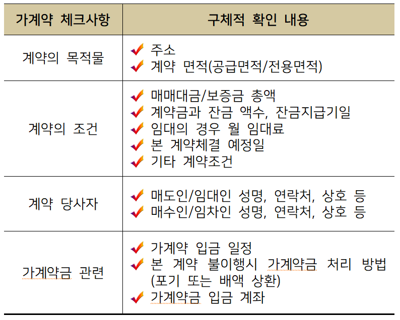 결국, 가계약에 구속력을 부여하기 위하여서는 계약의 중요사항에 관하여 상호 합의하고, 합의 내용에 분쟁의 소지가 없도록 최소한 문자 등으로 증거를 남겨 놓아야 합니다. 가계약 내용에 포함시켜 확인하여야 할 중요사항을 표로 정리해 보았습니다(이미지 표 참조).