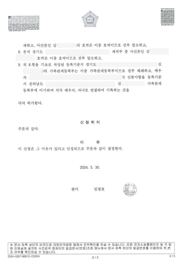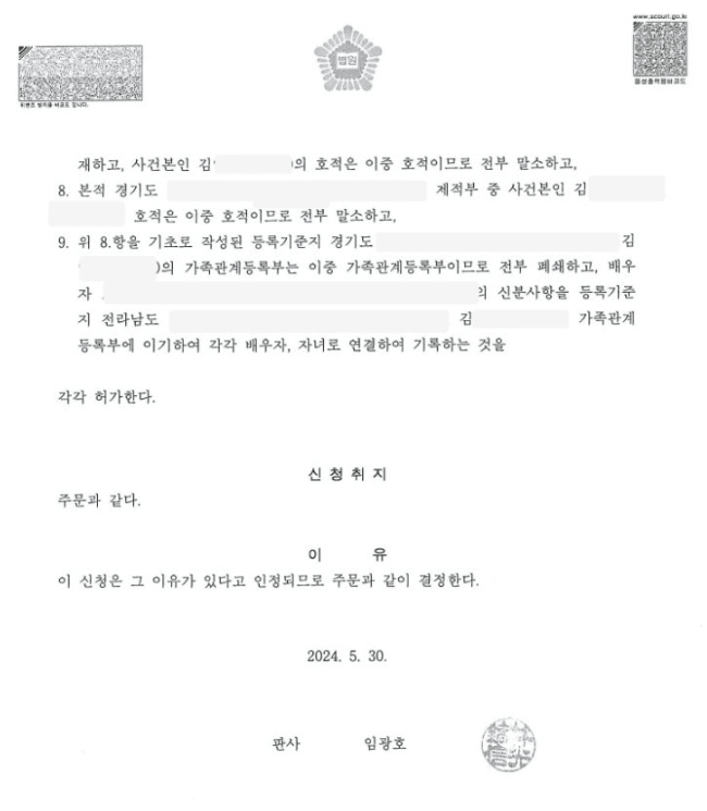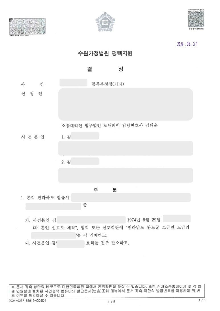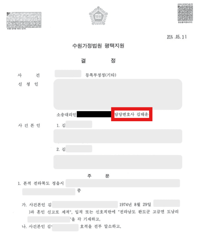 김태운 변호사는 복잡한 법적 절차를 차근차근 밟아가며, 법원에 이중호적 문제의 심각성과 시급성을 적극적으로 소명하였습니다. 그 결과 법원은 김태운 변호사의 주장을 받아들여 김00님의 이중호적을 말소하고, 관련 호적 및 가족관계등록부를 명확하게 정리하는 결정을 내렸습니다.