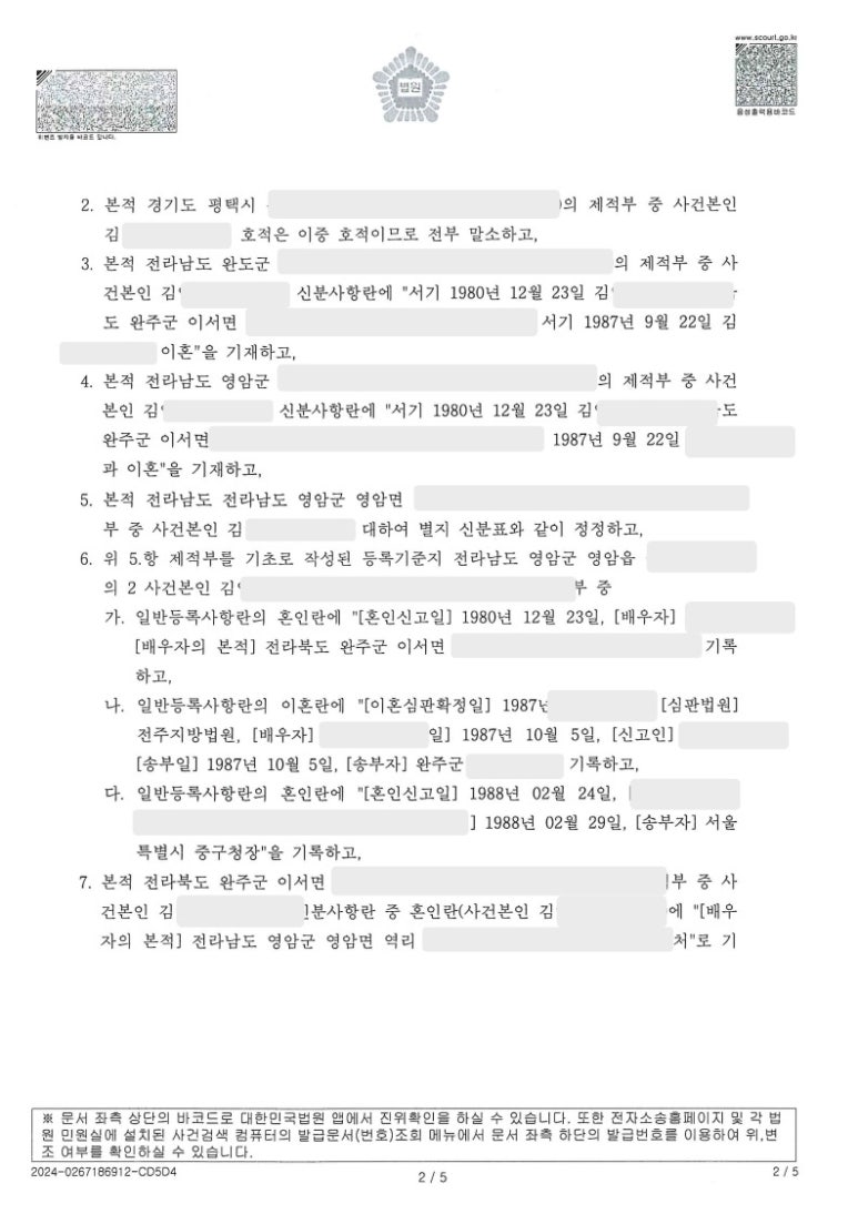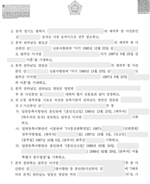 본 사건의 주인공인 김00님은 여러 차례의 혼인과 이혼, 그리고 복잡한 호적 변동으로 인해 이중호적이라는 어려운 상황에 놓이게 되었습니다. 사건본인 김00은 1974년 8월 29일 P와 첫 번째 혼인을 하였습니다.