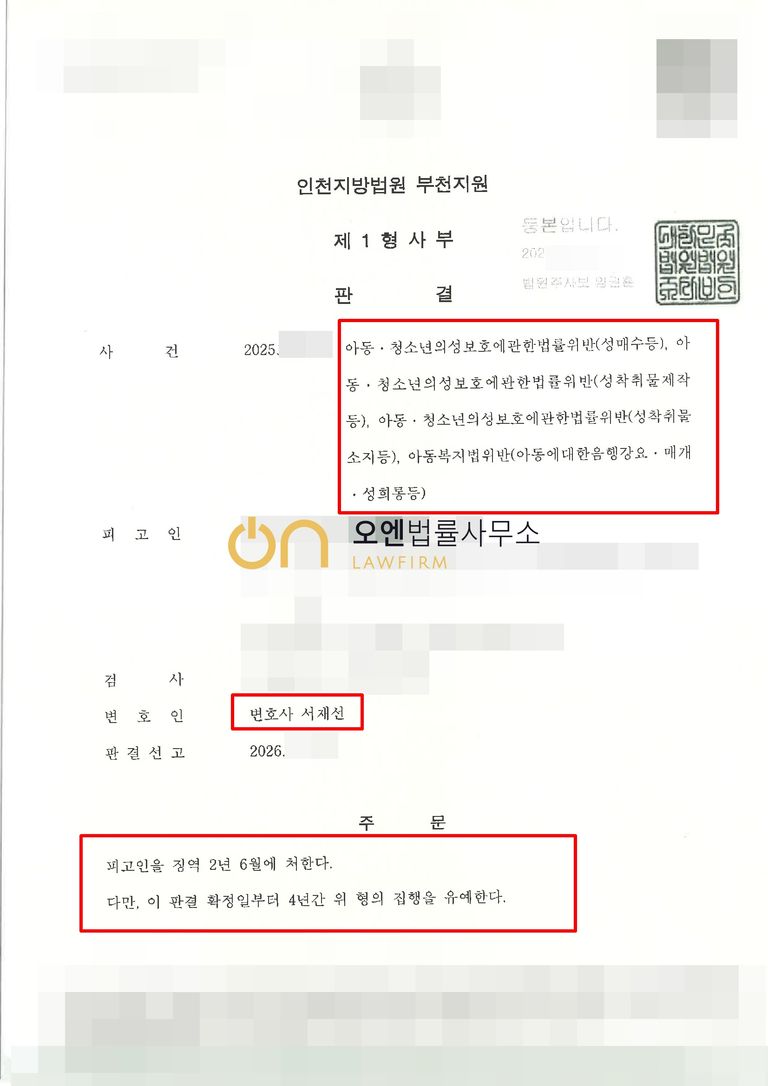법원은 아동·청소년 성착취물 제작이라는 무거운 혐의가 인정되었음에도 불구하고, 변호인의 주장을 받아들여 법정형의 하한(징역 5년)보다 낮은 징역 2년 6월을 선고하고, 그 형의 집행을 4년간 유예하는 판결을 내렸습니다. 이는 성착취물 제작 사건에서 매우 이례적인 선처로, 의뢰인은 구속을 면할 수 있었습니다.