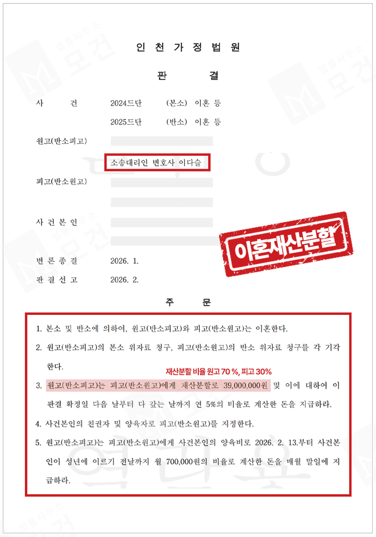 또 원고 명의 부동산은 원고가 그대로 보유하되, 그 정산금의 차액인 3,900만원을 원고가 피고에게 지급하기로 하는 재산분할이 확정되었습니다.
