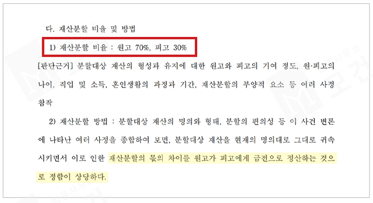 위와 같은 재산형성에 대한 부분, 현재 부동산은 원고 명의로 보유하고 있는 점, 두 사람의 짧은 혼인기간, 두 사람 사이에 자녀가 있고, 친권자 및 양육자로 엄마인 피고가 지정된 점 등이 재산분할 과정에서 고려됨에 따라 원고 70%, 피고 30%의 재산분할 비율이 인정될 수 있었습니다.