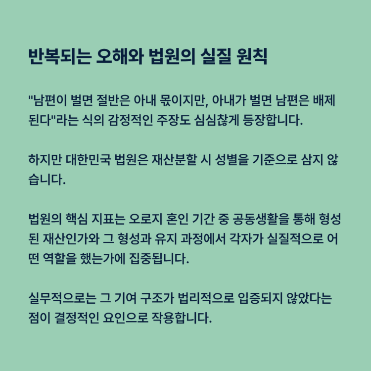이혼 재산분할에서 성별이 결과를 좌우한다는 인식은 여전히 강하게 남아 있습니다. "남편이 벌면 절반은 아내 몫이지만, 아내가 벌면 남편은 배제된다"라는 식의 감정적인 주장도 심심찮게 등장합니다.