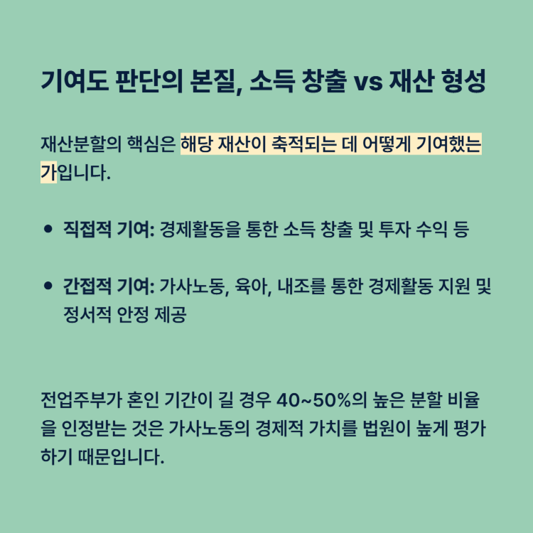 재산분할의 핵심은 단순히 ‘누가 외부에서 돈을 벌어왔는가’가 아니라, ‘해당 재산이 축적되는 데 어떻게 기여했는가’입니다.