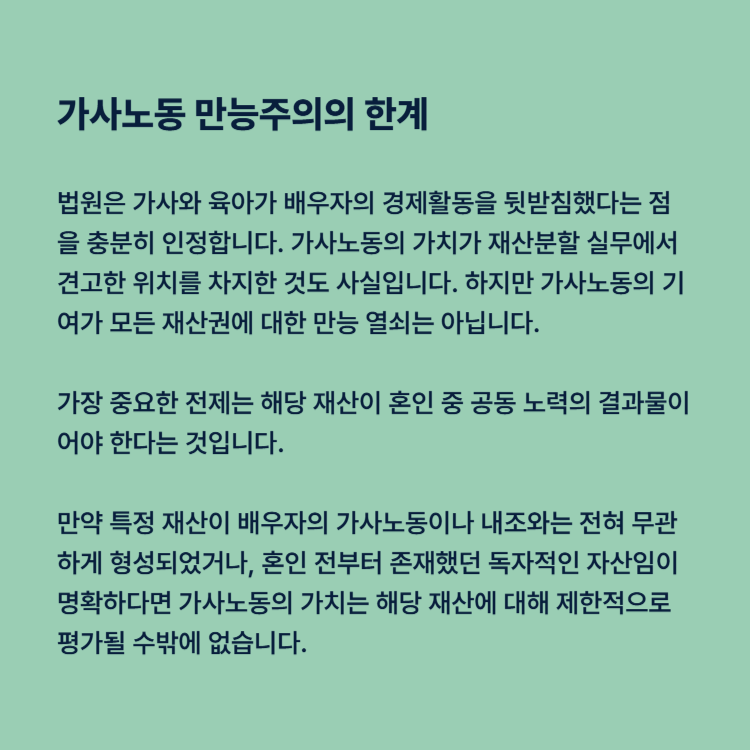 가사노동의 가치가 재산분할 실무에서 견고한 위치를 차지한 것은 사실입니다. 법원은 가사와 육아가 배우자의 경제활동을 뒷받침했다는 점을 충분히 인정합니다. 하지만 가사노동의 기여가 모든 재산권에 대한 만능 열쇠는 아닙니다.