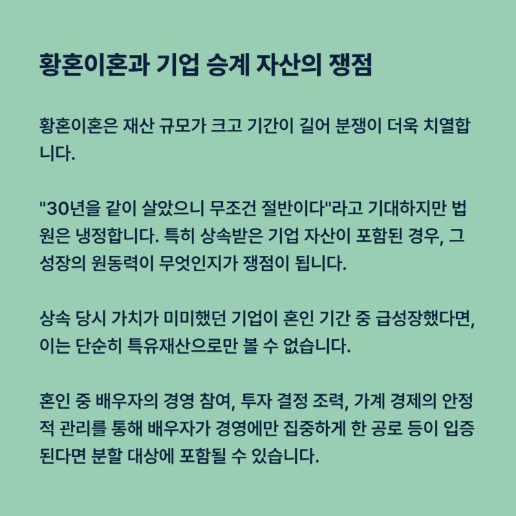 황혼이혼은 재산 규모가 크고 기간이 길어 분쟁이 더욱 치열합니다. "30년을 같이 살았으니 무조건 절반이다"라고 기대하지만 법원은 냉정합니다. 특히 상속받은 기업 자산이 포함된 경우, 그 성장의 원동력이 무엇인지가 쟁점이 됩니다.