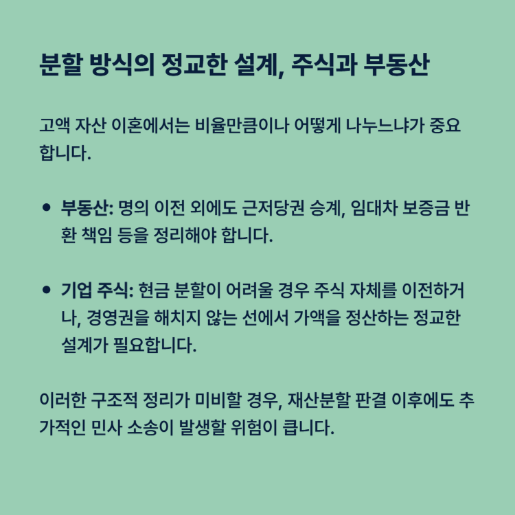 고액 자산 이혼에서는 비율만큼이나 어떻게 나누느냐가 중요합니다.