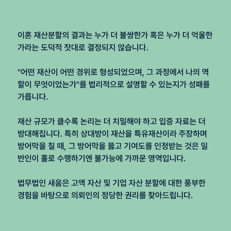 법무법인 새움은 고액 자산 및 기업 자산 분할에 대한 풍부한 경험을 바탕으로 의뢰인의 정당한 권리를 찾아드립니다. 100억 재산 앞에서도 당당하게 자신의 몫을 주장할 수 있는 법리적 근거, 새움이 마련해 드리겠습니다.