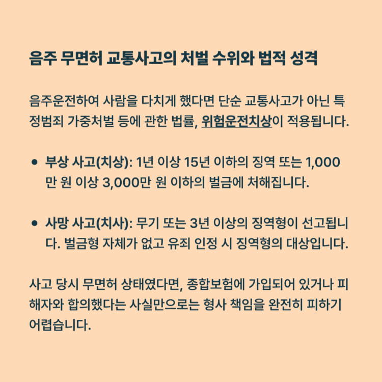 여기에 무면허 상태였다는 점까지 더해지면 죄질은 더욱 나빠집니다. 이는 12대 중과실 중에서도 가장 비난 가능성이 큰 항목들이 겹친 것이므로, 종합보험에 가입되어 있거나 피해자와 합의했다는 사실만으로는 형사 책임을 완전히 피하기 어렵습니다. 특히 혈중알코올농도가 높거나 사고와의 직접적인 인과관계가 뚜렷할수록 선처의 폭은 좁아질 수밖에 없습니다.