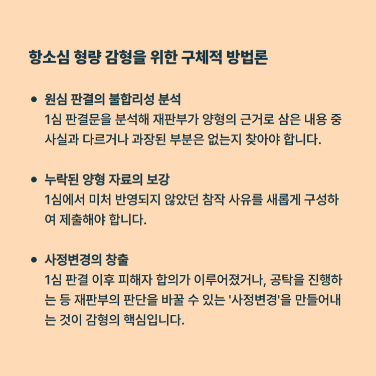 1심 판결 이후 피해자와의 추가 합의가 이루어졌거나, 새로운 공탁을 진행하는 등 재판부의 판단을 바꿀 수 있는 '사정변경'을 만들어내는 것이 감형의 핵심입니다.