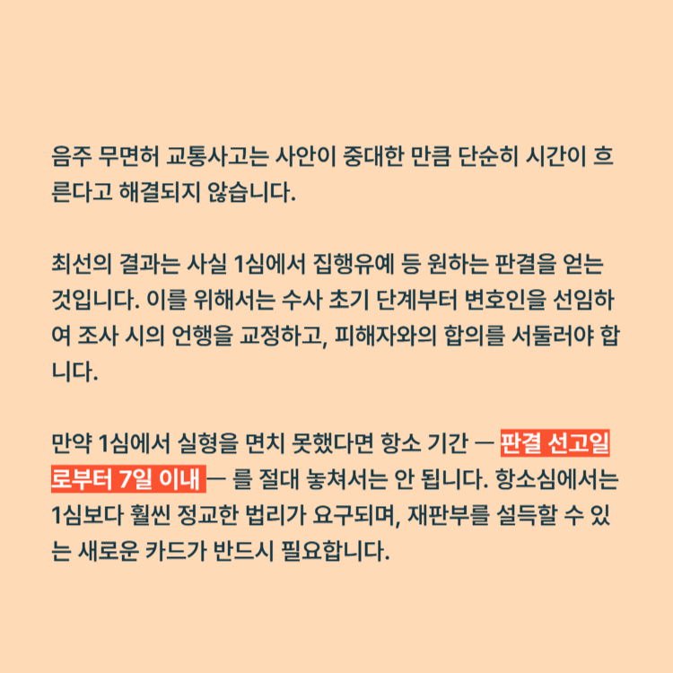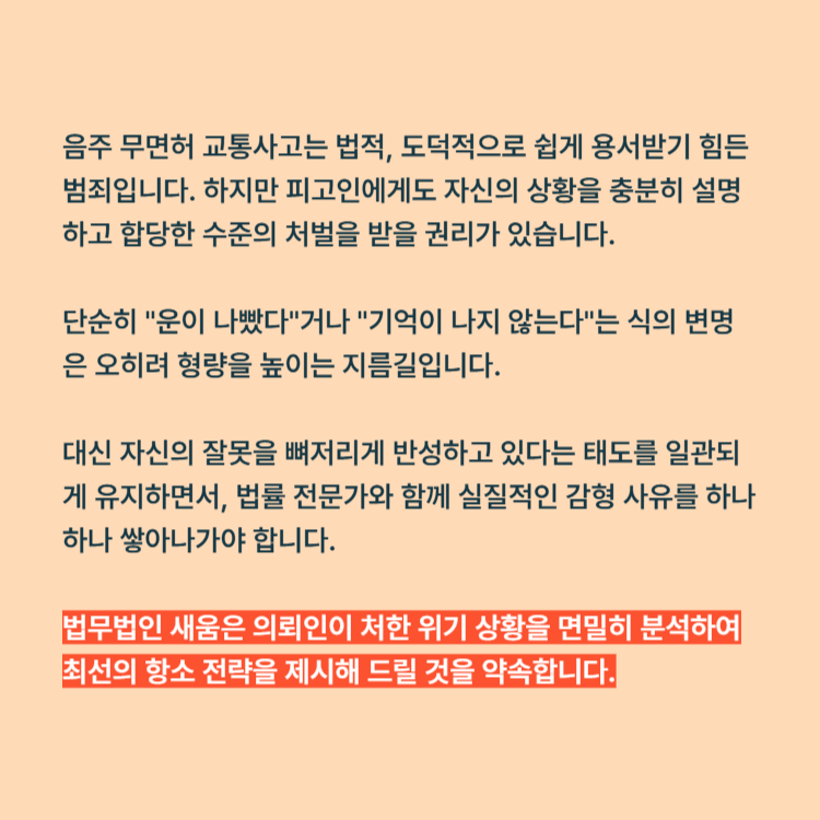 음주 무면허 교통사고는 법적, 도덕적으로 쉽게 용서받기 힘든 범죄입니다. 하지만 피고인에게도 자신의 상황을 충분히 설명하고 합당한 수준의 처벌을 받을 권리가 있습니다.