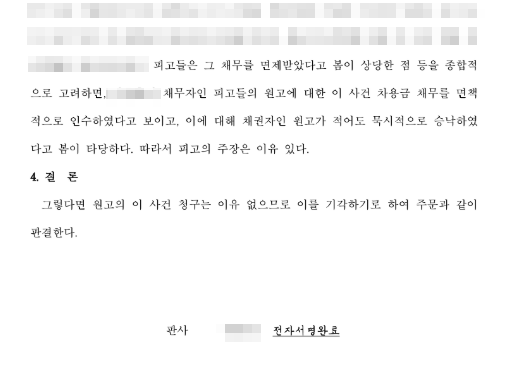 법원은 저희 측의 주장을 받아들여, 채권자가 제3자의 채무 인수를 승낙함과 동시에 상속인들의 채무를 면제해 준 것으로 판단했습니다.