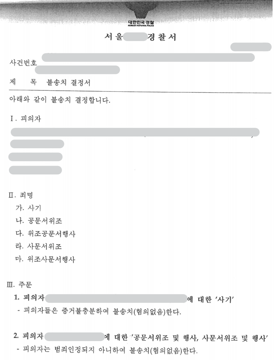결과는 예상대로였습니다. 사기, 공문서위조 및 동행사, 사문서위조 및 동행사 모든 혐의에 대해 '혐의없음(불송치)' 처분을 받아냈습니다.