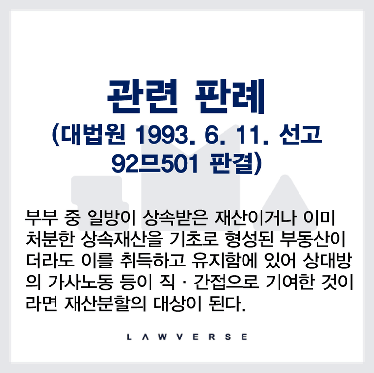 즉, 결혼 기간이 길거나 배우자의 기여도가 입증된다면 상속재산분할 분도 재산분할대상으로 삼아 이혼소송에서 유리한 고지를 점할 수 있습니다.
