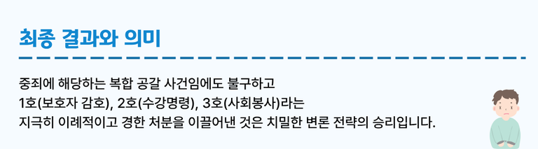 그 결과 1호 보호자 감호, 2호 수강명령, 3호 사회봉사 처분으로 경하게 종결되었습니다.