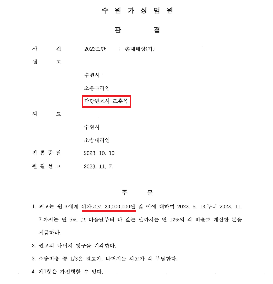 그러나 당시 사건을 담당하였던 수원가정법원은 "피고가 원고 배우자에게 보낸 메시지에서 원고 배우자에게 배우자와 자녀가 있다는 사정을 언급하고 있는 점 등에 비추어보면 원고 배우자에게 배우자가 있다는 사실을 충분히 알았거나 알 수 있었다고 판단되므로, 피고의 주장은 이유 없다"고 판단하면서 원고의 위자료 청구를 일부 인용(3천만 원 청구 중 2천만 원 인용)하는 판결을 내렸습니다.