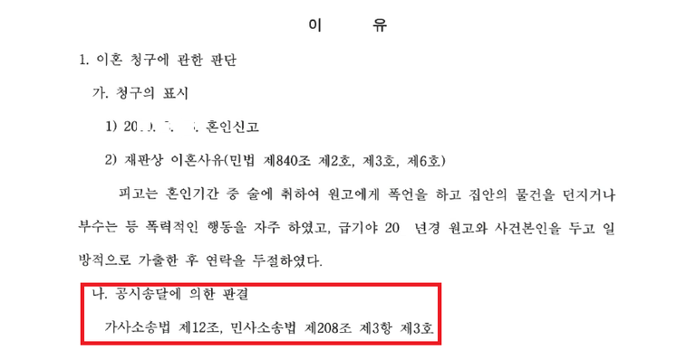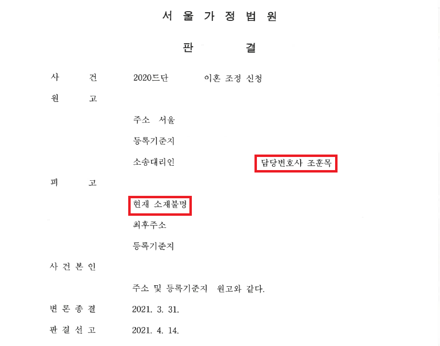 다행히도 당시 사건을 담당하였던 서울가정법원은 신속하게 공시송달 절차를 진행하였으며, 첫 번째 변론기일을 끝으로 변론을 종결하였고 선고기일에는 원고 청구를 전부 인용하는 판결을 내렸습니다.