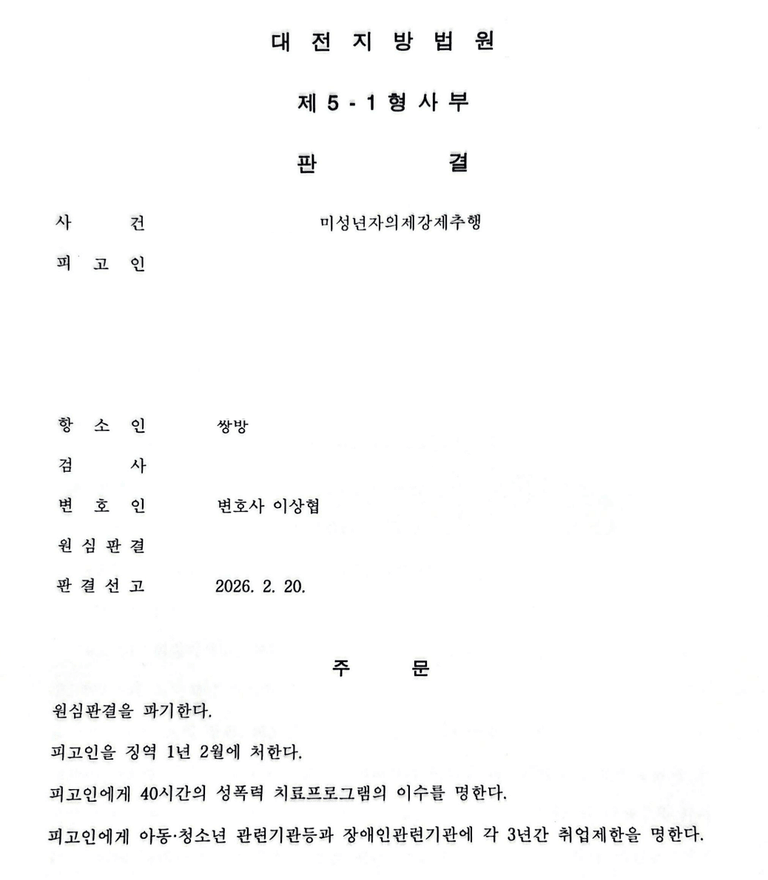 미성년자의제강제추행 항소심에서 합의 없이 감형 성공 (징역 1년 6월 → 1년 2월)