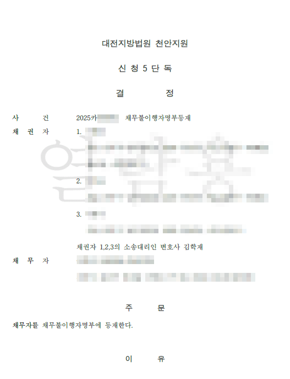 [승소] 2026년 2월 10일 채무불이행자명부등재 결정