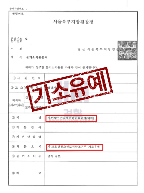 검찰은 피의 사실은 모두 인정된다고 보았습니다. 하지만 테헤란이 주장한 의뢰인의 진지한 반성 태도와 재범 방지 의지, 그리고 주변인들의 강력한 탄원을 적극적으로 수용했습니다. 결과적으로 대마와 엑스터시 구매 및 투약이라는 다수의 혐의가 경합되었음에도 불구하고, 검찰은 전 건에 대하여 재판에 넘기지 않는 기소유예 처분을 내렸습니다.