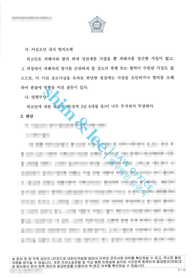 - 1심에서 범행을 인정하며 합의를 요청하던 피고인은 2심이 시작되자 태도를 바꾸어 “1심에서는 변호인의 권유로 범행을 인정했을 뿐”이라며 다시 서로 호감을 가지고 합의하에 이루어진 성관계였다고 주장하며 무죄를 다투기 시작했습니다. 심앤이는 피고인의 반복된 입장 변경과 모순된 주장들을 구체적으로 반박하는 의견서를 제출해, 항소심에서 판단이 뒤집히지 않도록 적극적으로 조력했습니다.