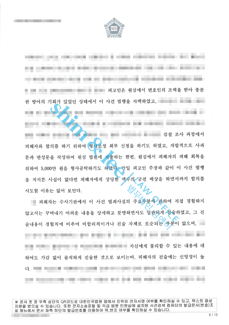 ④ 1심(원심) 재판 단계에서는, 변호인의 조력을 받으며 충분한 방어 기회를 있었음에도 불구하고 돌연 범행을 자백했습니다. 자발적으로 사과문과 반성문을 제출하며 피해자에게 간절히 합의를 요청했고, 최후진술에서도 반성의 태도를 보였습니다.