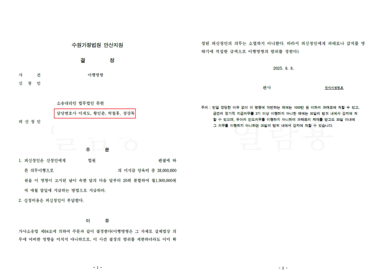 법무법인 류헌은 의뢰인의 상황을 면밀히 검토한 결과, 기존 이행명령에서 제외된 미지급 양육비를 정리하여 새롭게 이행명령을 신청했습니다. 그 결과, 미지급 양육비 중 3,800만 원을 20회 분할하여 매월 190만 원씩 지급하도록 결정받았으며, 채무자가 이를 이행하지 않을 경우 과태료 부과 또는 최대 30일의 감치(인신구속)까지 가능하도록 강력한 제재수단을 확보했습니다.