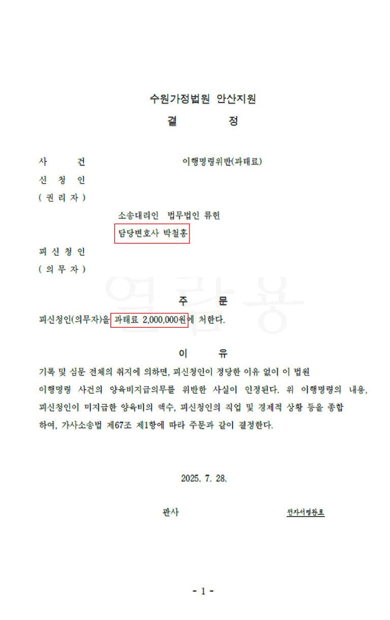 이번 사건을 통해 의뢰인은 그동안 받지 못했던 양육비를 확보할 수 있었고, 채무자에게 실질적 부담을 부과할 수 있는 법적 조치를 마련했습니다. 과태료 부과와 감치, 재산명시절차, 채무불이행자 등록 등 다양한 강제 수단을 동시에 적용하여 양육비 지급을 효과적으로 이끌어낸 사례로, 법무법인 류헌의 전략적 판단과 신속한 대응이 만들어낸 대표적인 성과입니다.
