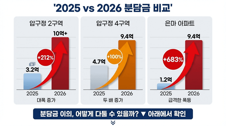 2026년 1월, 서울 강남구 압구정2구역 재건축 추정분담금이 공개되면서 조합원들 사이에 충격이 퍼졌습니다. 전용 152㎡ 소유자가 전용 128㎡를 신청할 경우 분담금이 10억 원을 넘어선 것입니다. 불과 1년 전 추정치가 3억 2,000만 원이었으니, 3배 넘게 뛴 셈입니다.