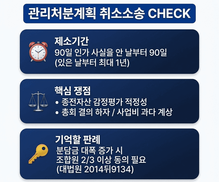 2단계 : 관리처분계획 인가 사실을 안 날부터 90일 이내 (골든타임): 취소소송 제기를 검토해야 합니다. 종전자산 평가액, 사업비 산정, 총회 결의 하자 등을 다툴 수 있는 마지막 기회입니다. 인가 고시가 있은 날부터 1년이 지나면 소송 자체가 불가능해집니다.