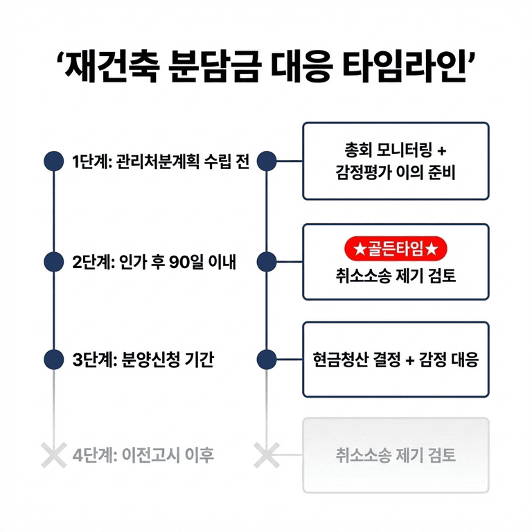 모든 단계에서 공통되는 핵심은 "시기"입니다. 90일의 제소기간, 분양신청 기한, 매도청구 대응 기한 등 각 단계마다 법적 데드라인이 있고, 이를 넘기면 선택지가 급격히 줄어듭니다.