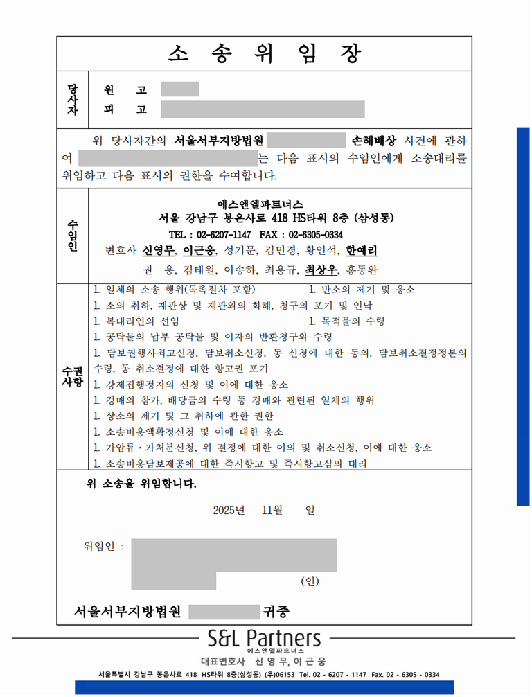 메일로 사건위임계약서와 법원에 제출할 소송위임장을 송부드리며,