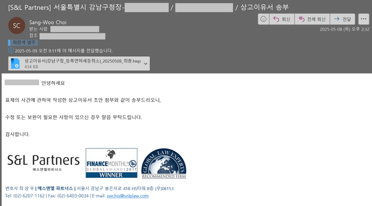 서면 초안이 완성되면 아래와 같이 메일로 의뢰인께 송부드려