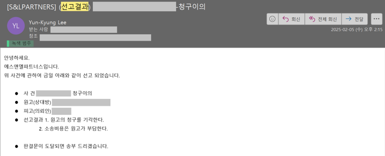 며칠 내로 법원으로부터 판결문을 수취하여 의뢰인께 전달드립니다