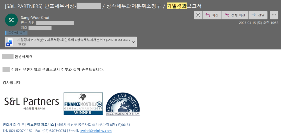 재판이 끝난 후 의뢰인께 전화 또는 메일로 변론 경과를 요약하여 보고드리며,
