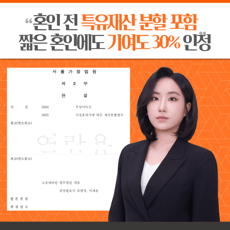 4년의 혼인 기간에도 불구하고 혼인 전 취득한 재산 전부가 재산분할의 대상으로 포함되었으며, 기여도도 30% 인정받는 쾌거를 달성했습니다.