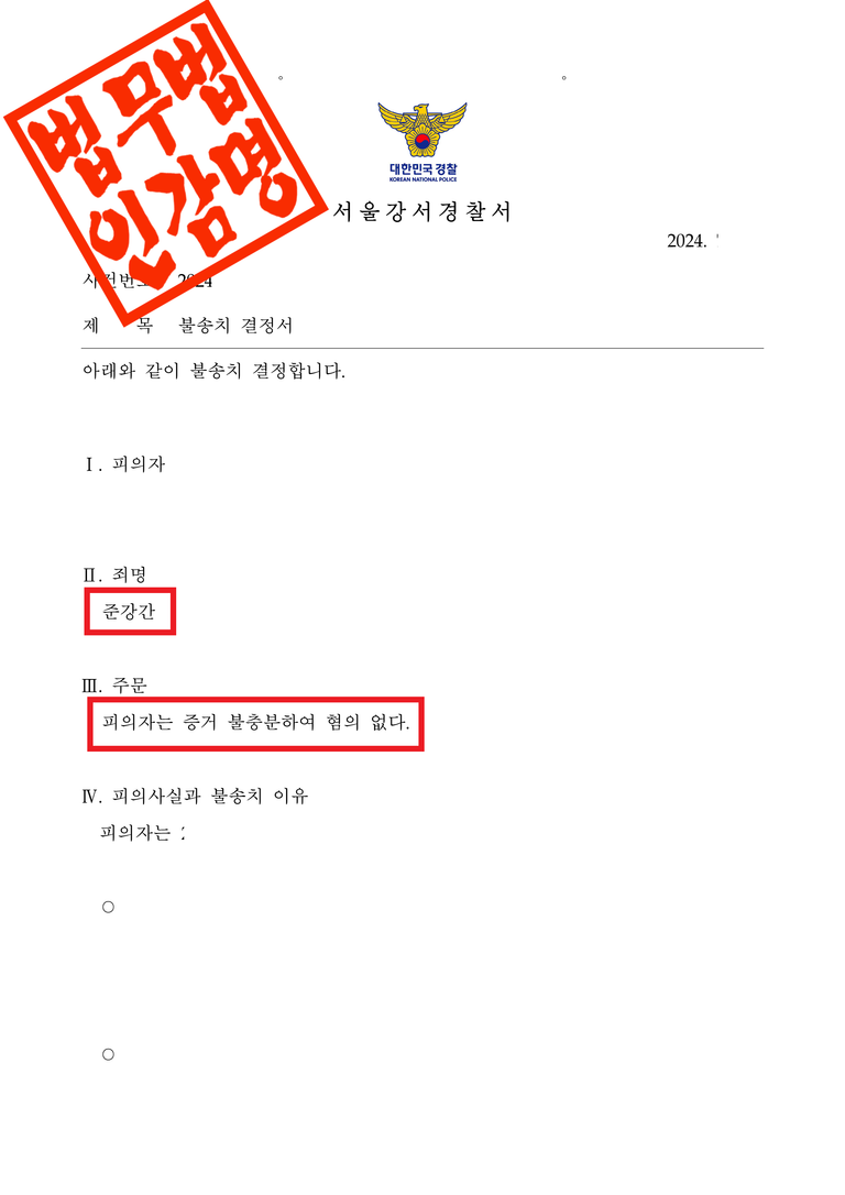 서울강서경찰서는 이 사건에 대해 다음과 같은 사유로 불송치 결정을 하였습니다.