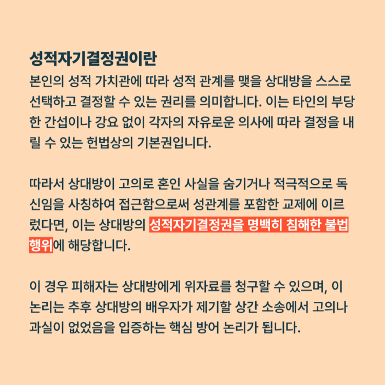 우리가 연애 상대방을 선택할 때, 상대방이 법률상 혼인 관계가 있는지 여부는 선택을 결정짓는 지극히 중대하고 본질적인 요소입니다. 따라서 상대방이 고의로 혼인 사실을 숨기거나 적극적으로 독신임을 사칭하여 접근함으로써 성관계를 포함한 교제에 이르렀다면, 이는 상대방의 성적자기결정권을 명백히 침해한 불법행위에 해당합니다.