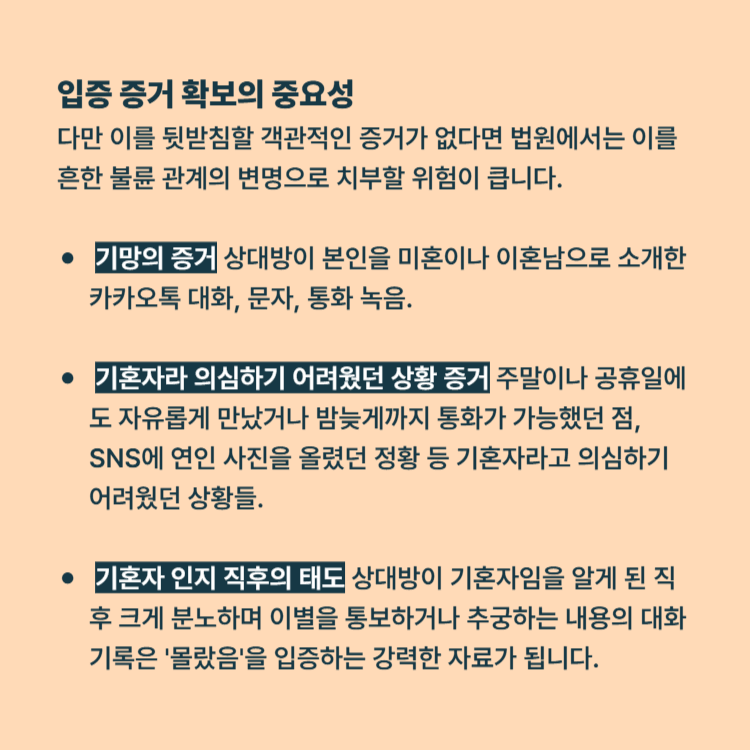 상대방에게 속아서 억울한 연애를 했다고 주장하더라도, 이를 뒷받침할 객관적인 증거가 없다면 법원에서는 이를 흔한 불륜 관계의 변명으로 치부할 위험이 큽니다. 따라서 다음과 같은 증거를 철저히 확보해야 합니다.