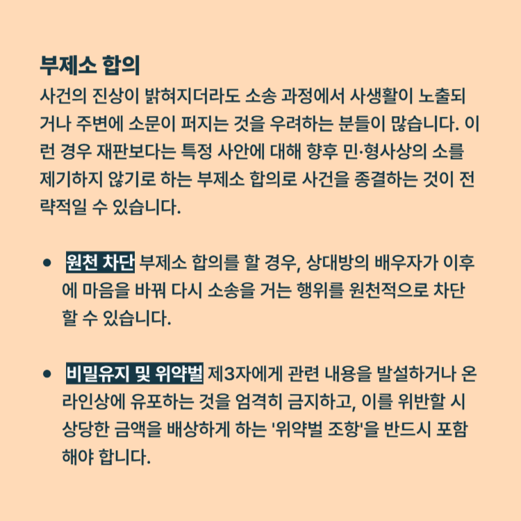 사건의 진상이 밝혀지더라도 소송 과정에서 사생활이 노출되거나 주변에 소문이 퍼지는 것을 우려하는 분들이 많습니다. 이런 경우 판결까지 가기보다는 부제소 합의를 통해 신속하고 은밀하게 사건을 종결하는 것이 전략적일 수 있습니다.