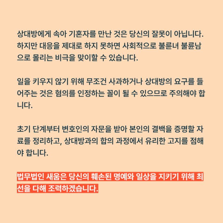 상대방에게 속아 기혼자를 만난 것은 당신의 잘못이 아닙니다. 하지만 대응을 제대로 하지 못하면 사회적으로 불륜녀 불륜남으로 몰리는 비극을 맞이할 수 있습니다.