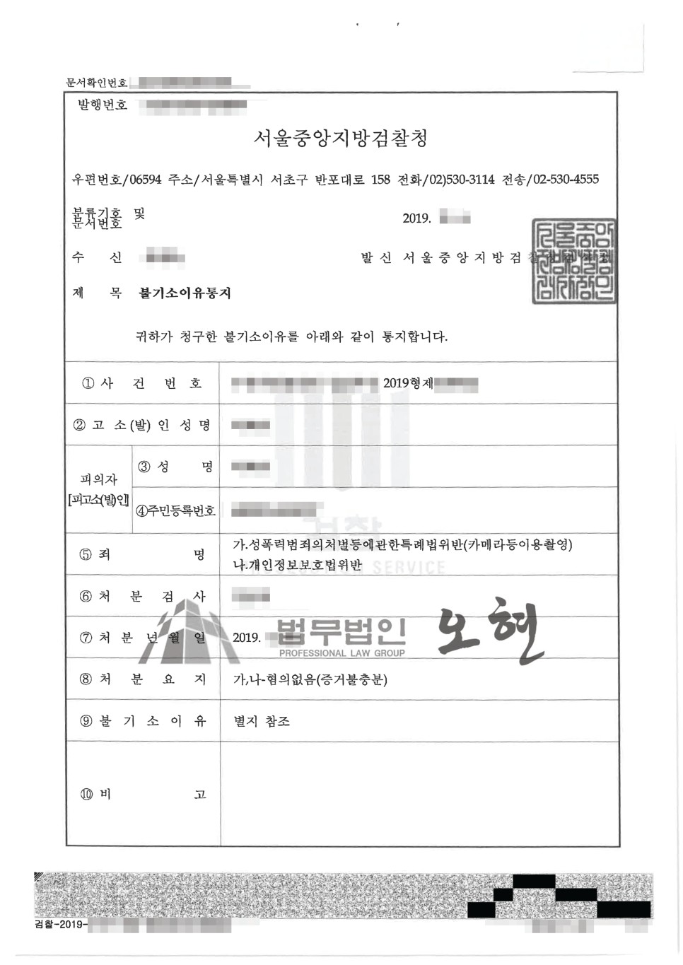 담당검사는 “CCTV카메라를 설치한 목적이 고소인의 일거수일투족을 감시하기 위한 것임을 인정하기 어렵다”며 ① 개인정보보호법 위반, ② 카메라등이용촬영죄 모두 혐의없음 처분하였습니다.