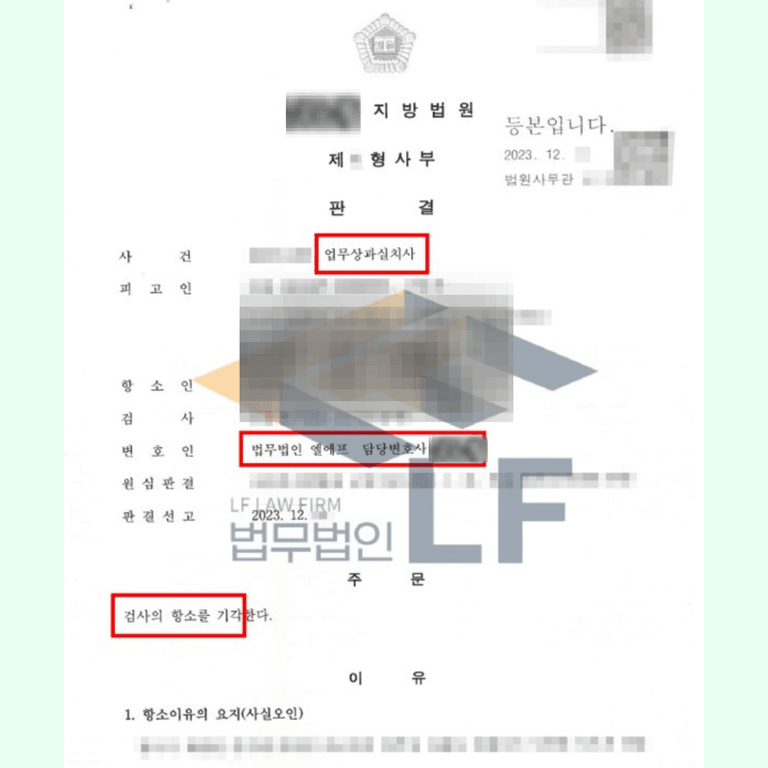 항소심 재판부에서는, 본 변호인의 주장을 받아들여, 검사의 항소를 기각하고 의뢰인에 대한 무죄 판결을 확정했습니다.
