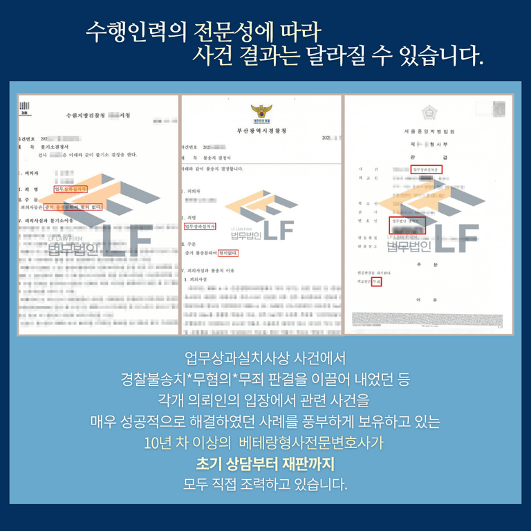 담당 변호인의 전문성 및 관련 사건 해결 경험 정도, 사건 해결 능력에 따라 사건 진행 방향은 물론 결과적인 부분까지 달라질 수 있습니다.