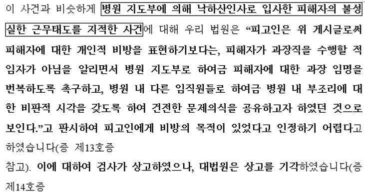 저희는 이 같은 법적 판단 기준을 토대로, 의뢰인의 댓글이 특정인을 공격하기 위한 목적이 아니라, 직장 동료 및 해당 업계의 예비 취업자들에게 유익한 정보를 제공하려는 공익적 의도에서 비롯된 것임을 입증했습니다.더불어, 비방의 목적이 부정되고 공공의 이익이 인정된 다수의 유사 판례들을 선별하여 제출함으로써, 저희 주장의 신뢰성과 설득력을 한층 더 강화했습니다.