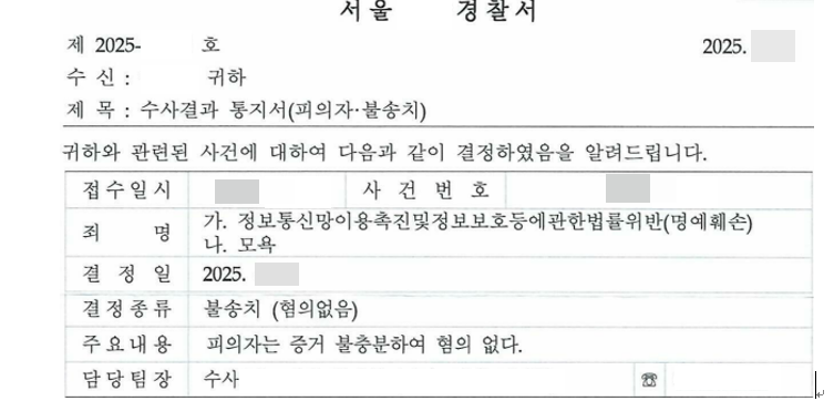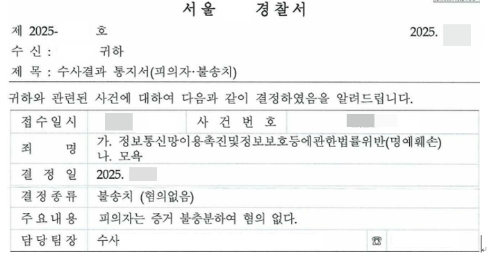 블라인드 댓글 허위사실 명예훼손 불송치 방어성공